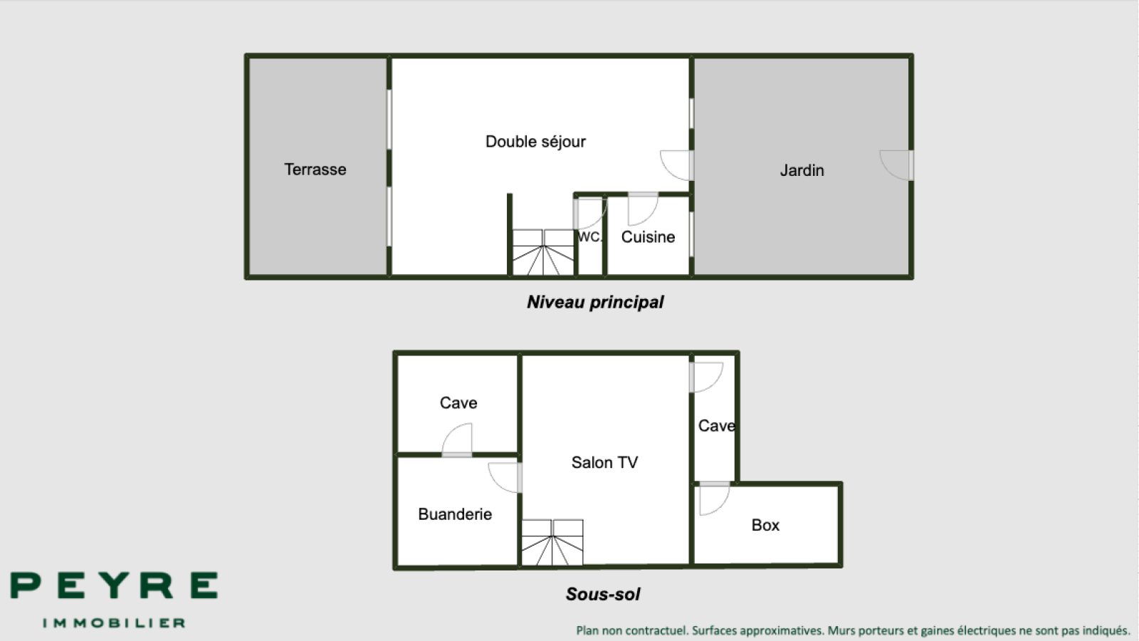 - Au sous-sol : salon TV, buanderie, 2 caves et un box avec accès direct depuis la maison.