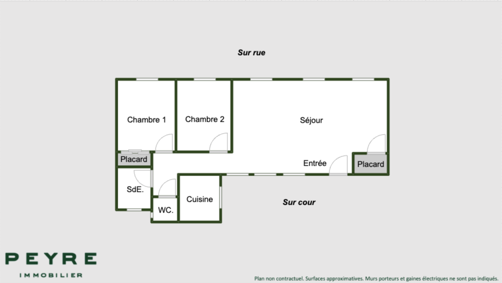 L’agencement est le suivant : entrée, séjour, cuisine indépendante aménagée et équipée, 2 chambres, salle d’eau et WC.