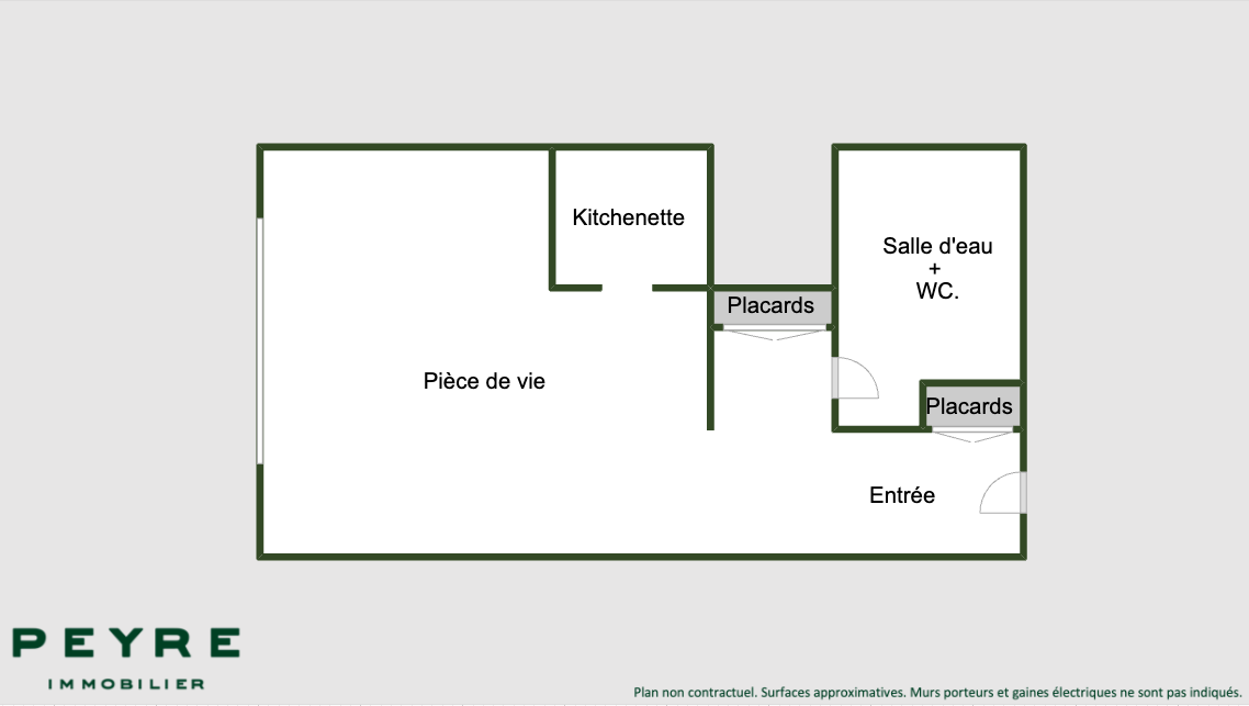 L’agencement est le suivant : entrée, pièce de vie, cuisine indépendante, salle d’eau avec WC.